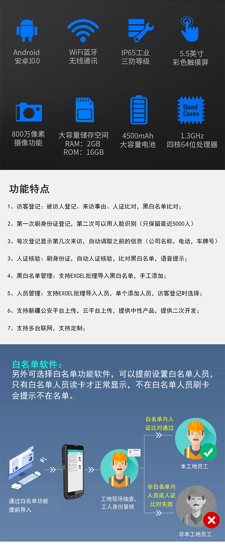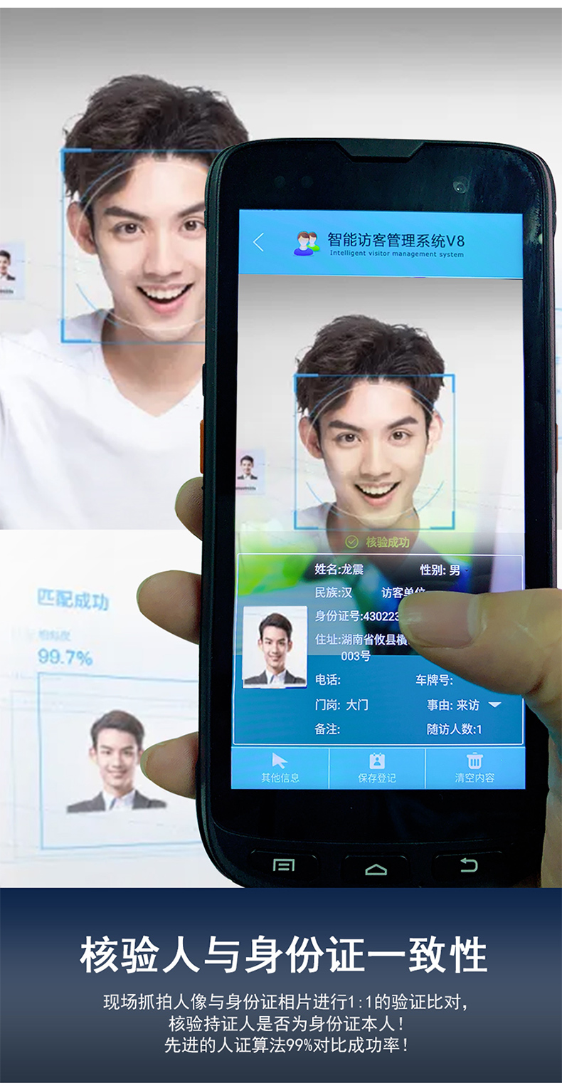產品支持身份證識別,人證對比,黑名單比對,來訪登記,支持4g,云平臺上傳,提供二次開發,支持訂制