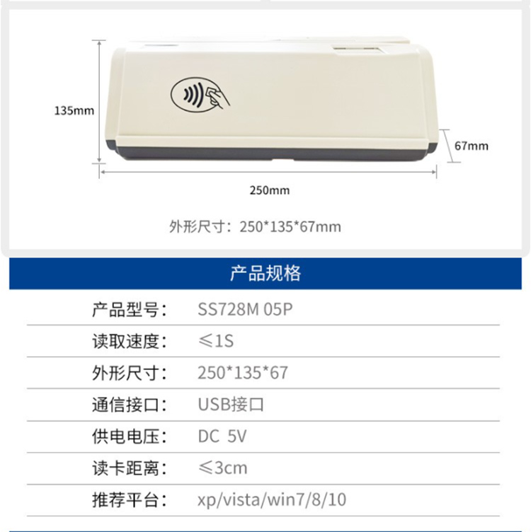 (*由于產品升級或其他原因,神思醫保卡讀卡器SS728-M05P產品實際參數有可能變更,以實際產品為準。本文中的所有陳述、信息和建議也不構成任何明示或暗示的擔保)